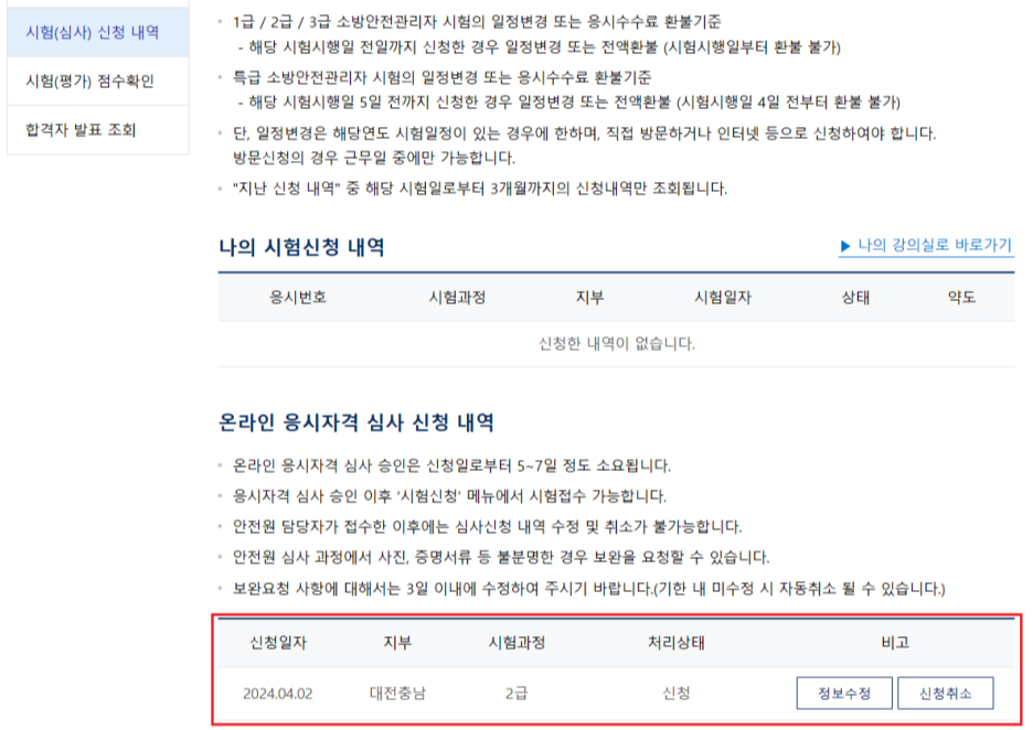 심사 신청을 완료하고 나니 온라인 응시자격 심사 신청 내역에서 신청내역 확인 가능합니다.
