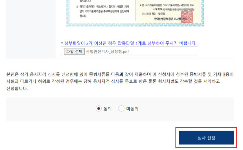 홈페이지 가입 후 응시자격 심사 신청으로 이동해 인적사항을 기재하고 자격증에 사용할 사진 파일을 업로드한 뒤