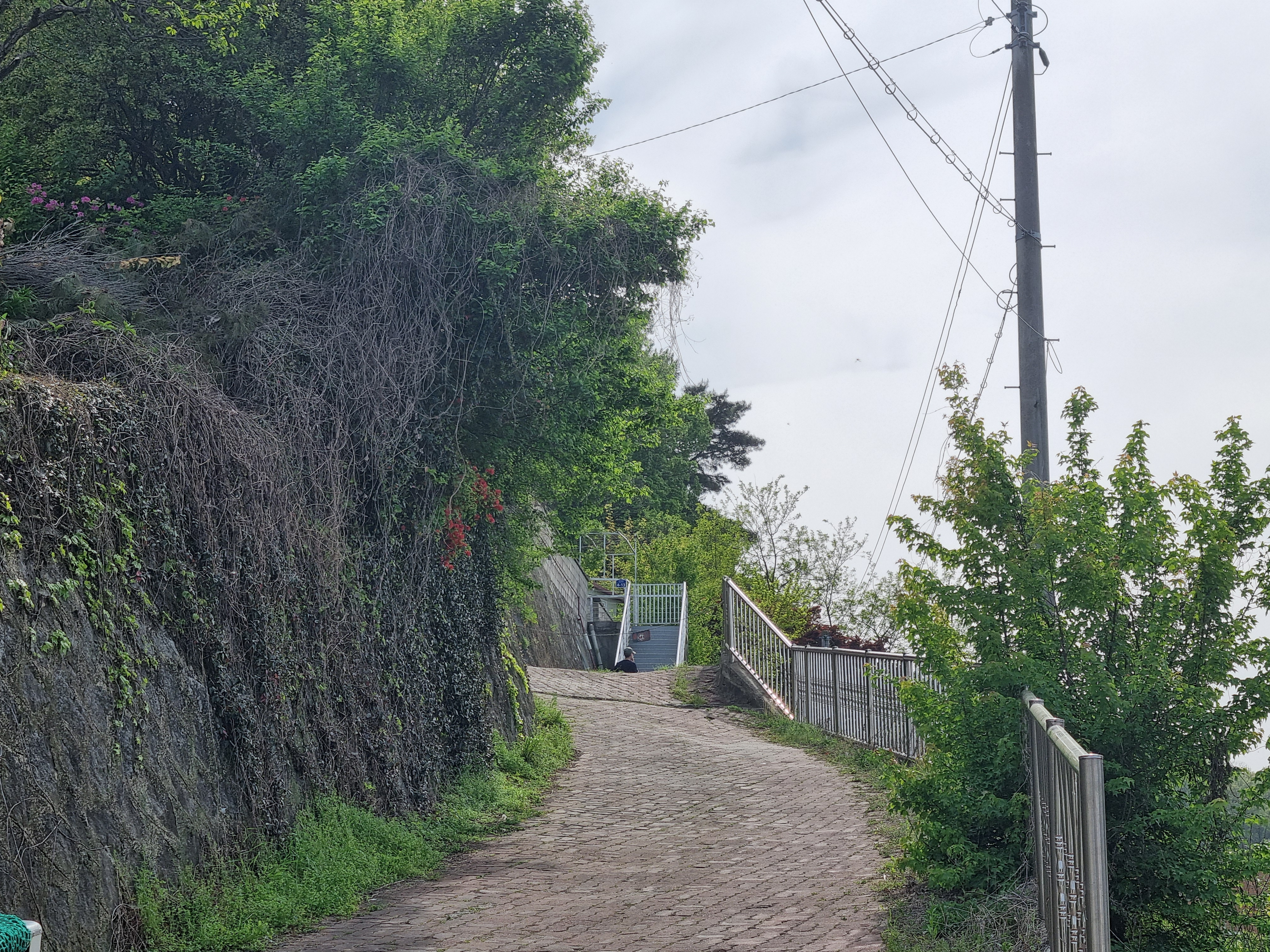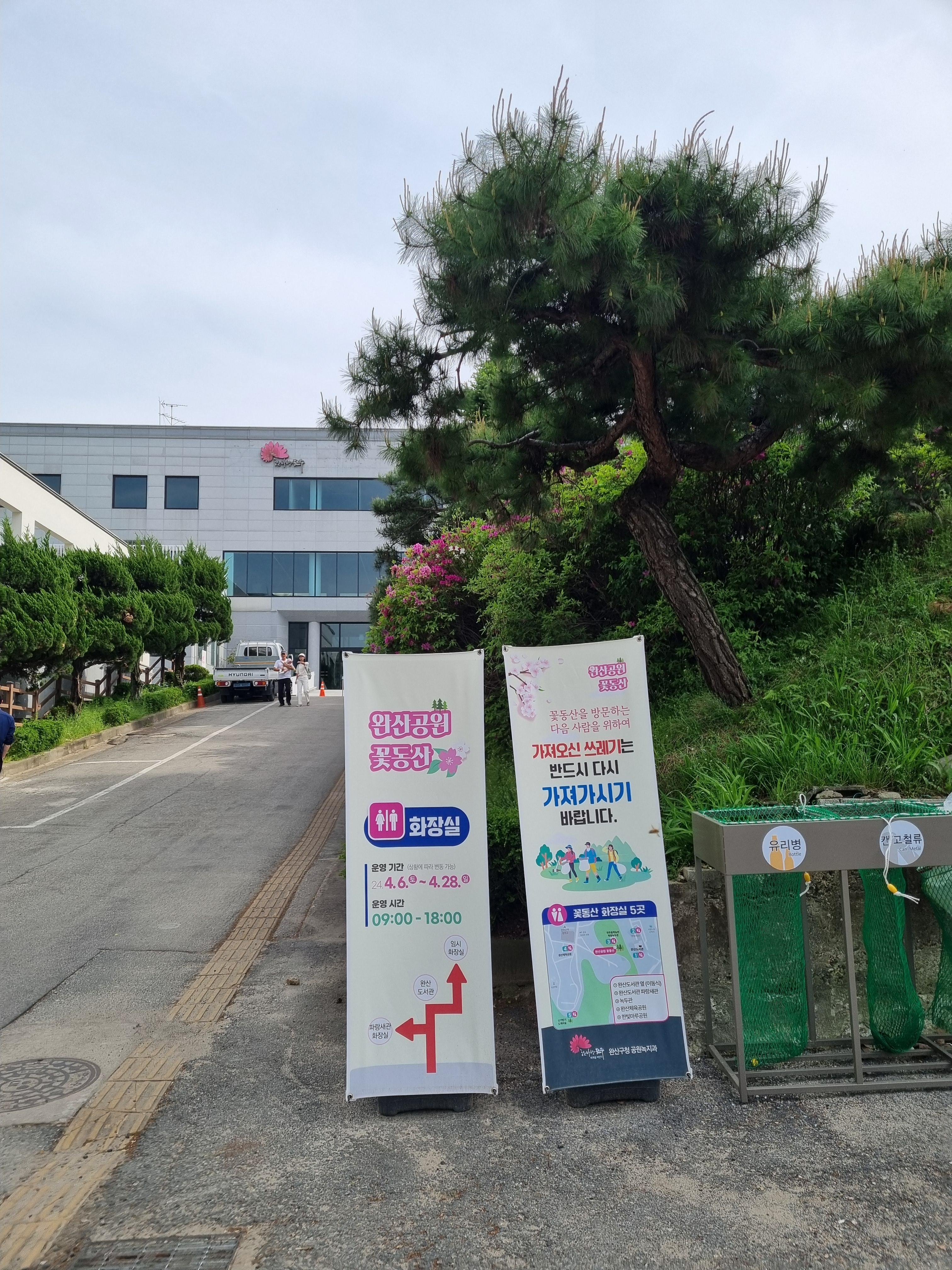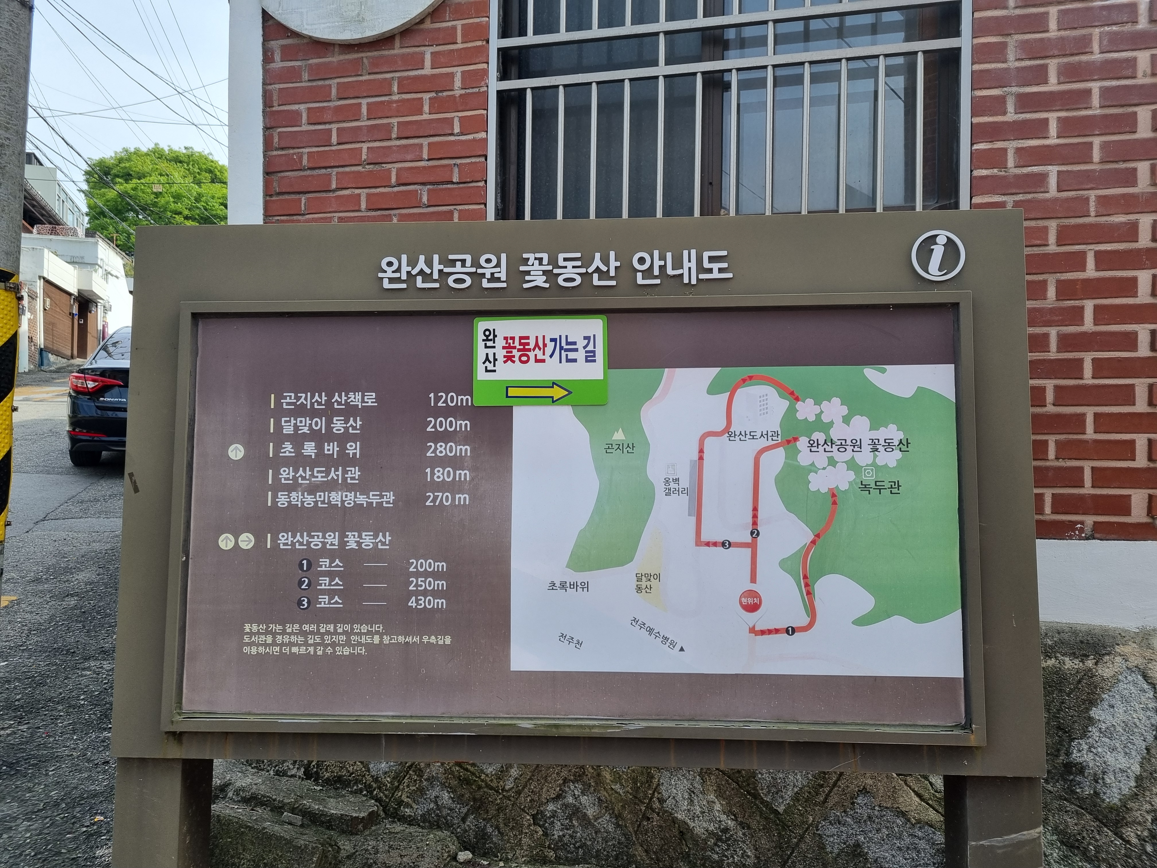 진입로에 있는 꽃동산 안내도의 화살표대로 이동하지 말고 직진해 완산도서관 쪽으로 올라가세요.