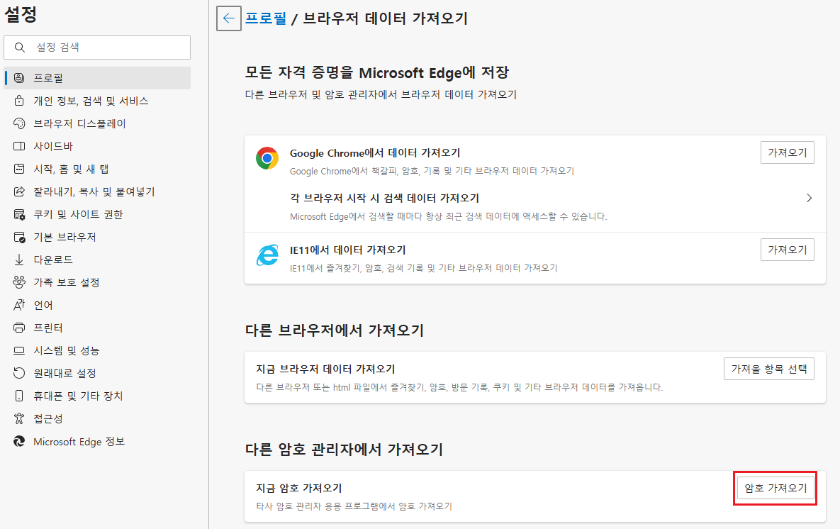 프로필/브라우저 데이터 가져오기 탭에서 맨 밑에 위치한 다른 암호 관리자에서 가져오기 '암호 가져오기'를 클릭합니다.