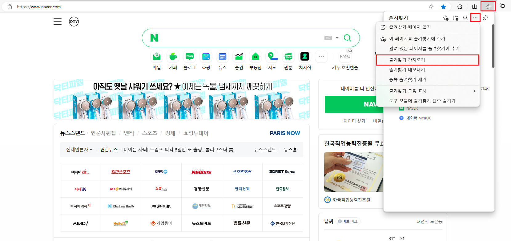 저장 완료 후 인터넷에 접속해 같은 방법으로 즐겨찾기 탭을 눌러 '즐겨찾기 가져오기'를 실행합니다.