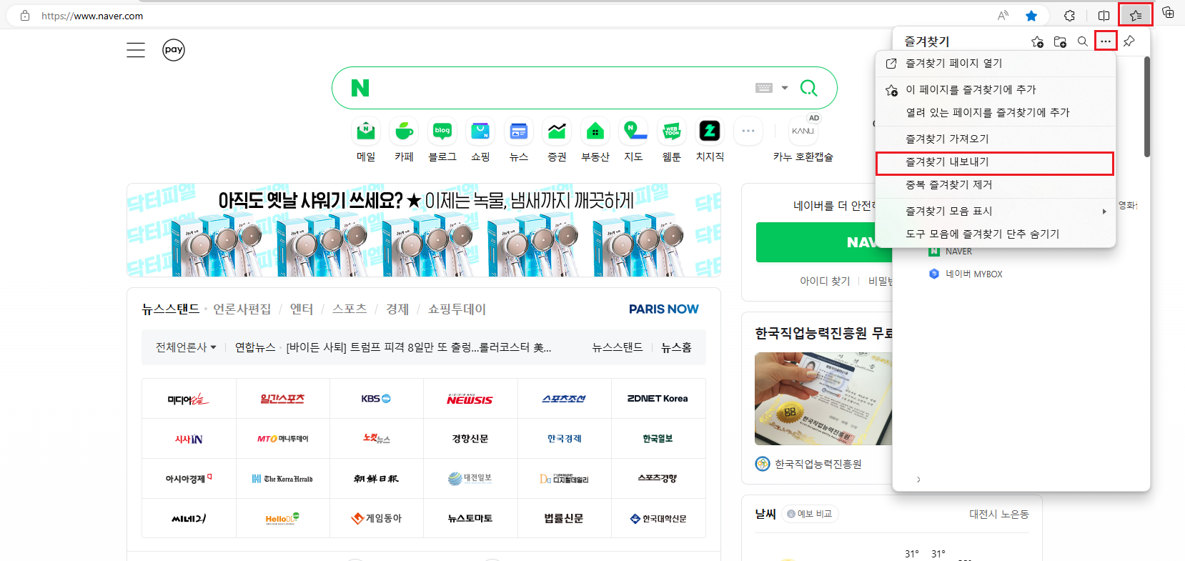 인터넷 브라우저를 열어 오른쪽 끝 즐겨찾기에서 점 세 개를 누른 뒤 즐겨찾기 내보내기 작업을 해줍니다.