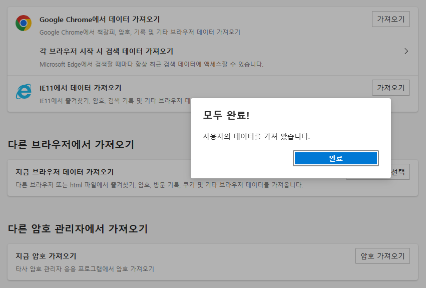 이렇게 모두 완료가 나온 뒤에 인터넷을 실행해 '즐겨찾기 목록'을 확인해 보세요.