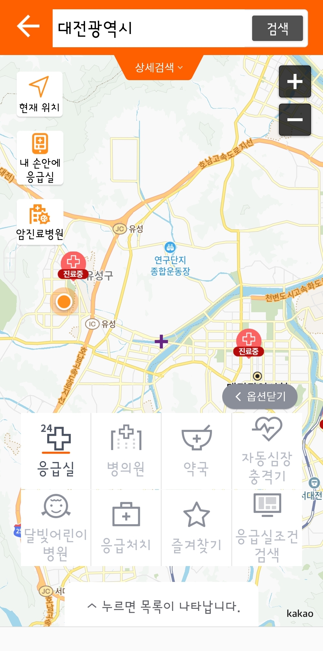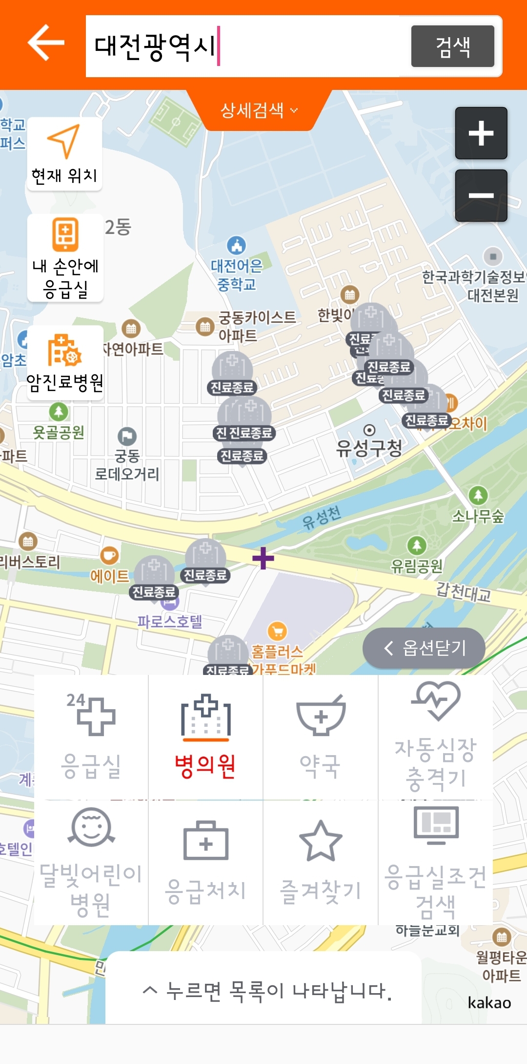 앱 다운로드 후 지역별로 응급실, 병의원, 약국 등을 구분해 진료 중인 병의원과 운영 중인 약국 확인이 가능합니다.